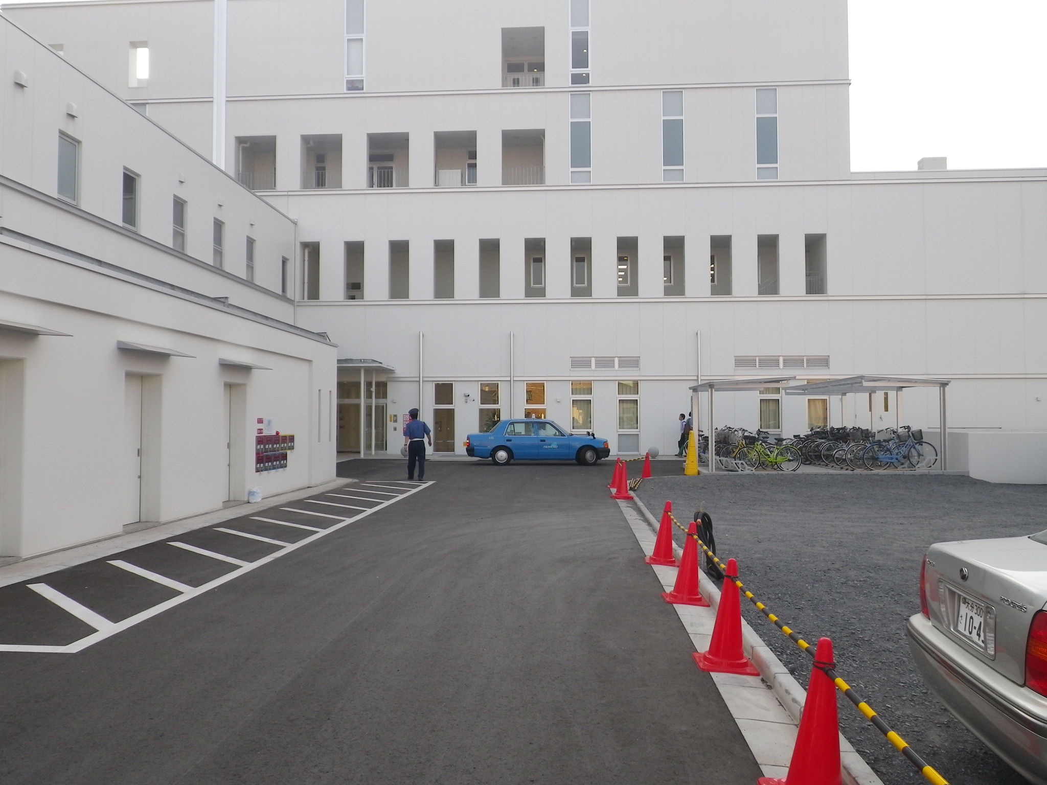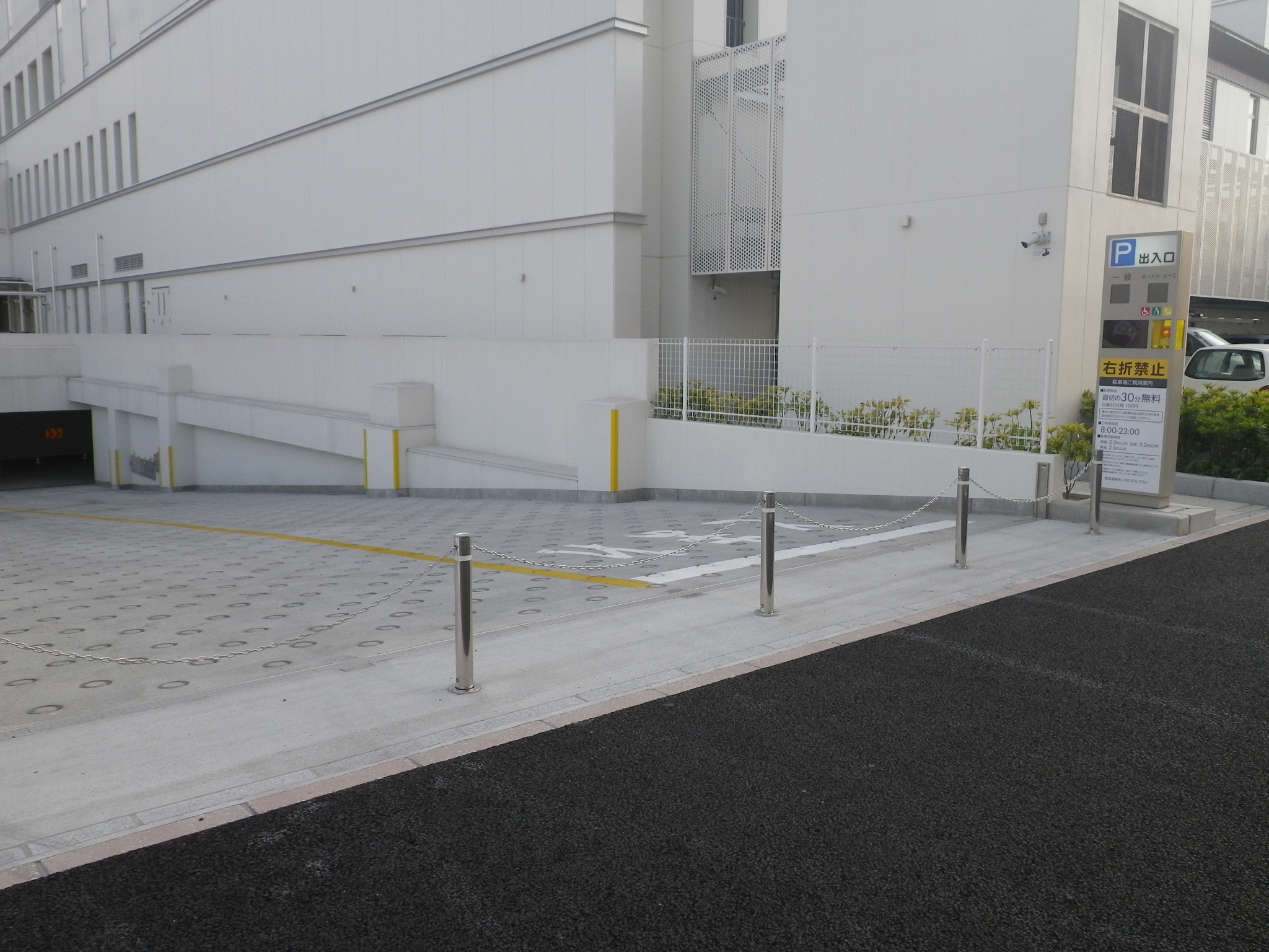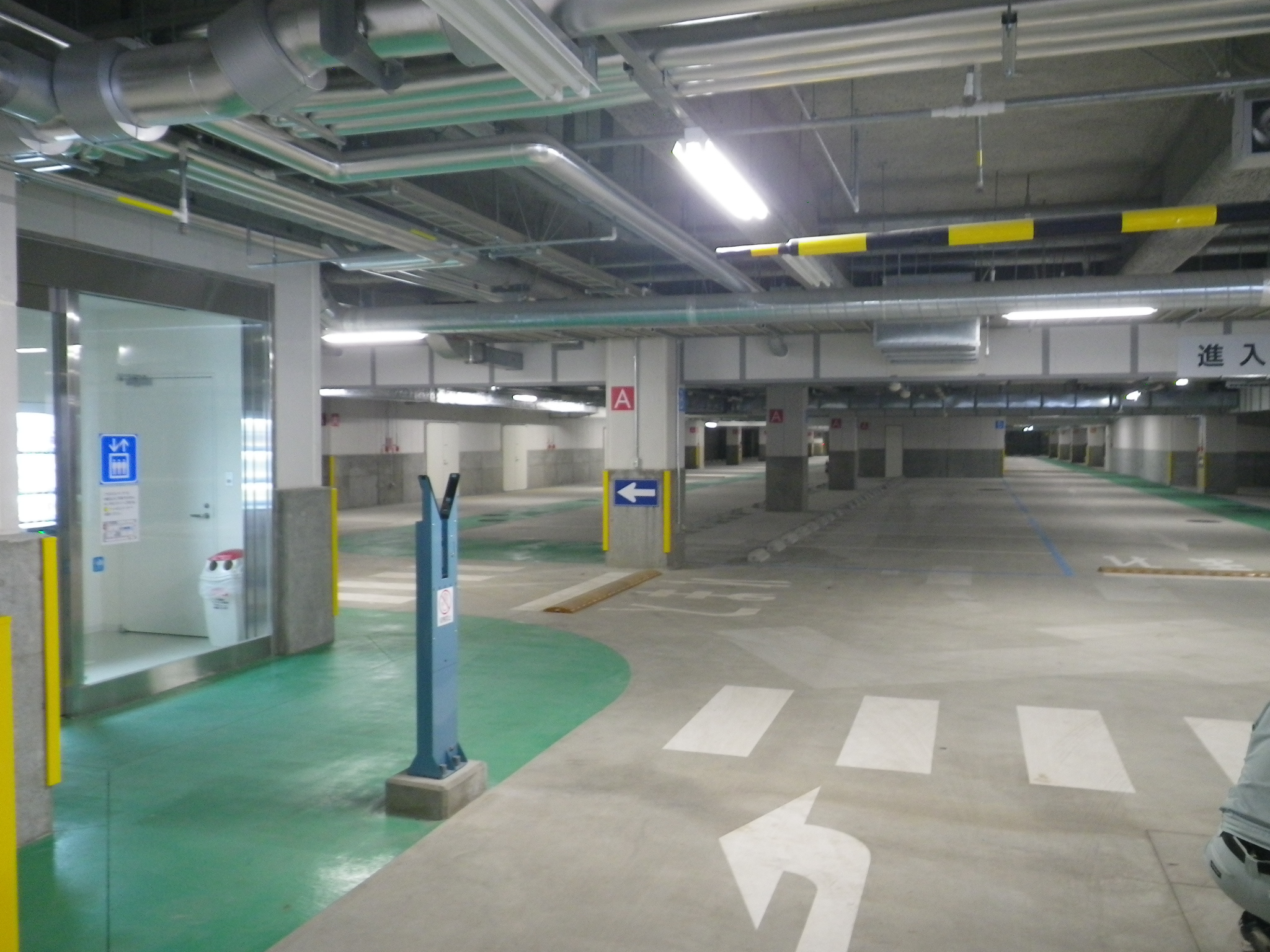 写真中央の入口がエレベータですので、スペースがございましたら、お近くにお止めになり、エレベータにお乗り下さい。