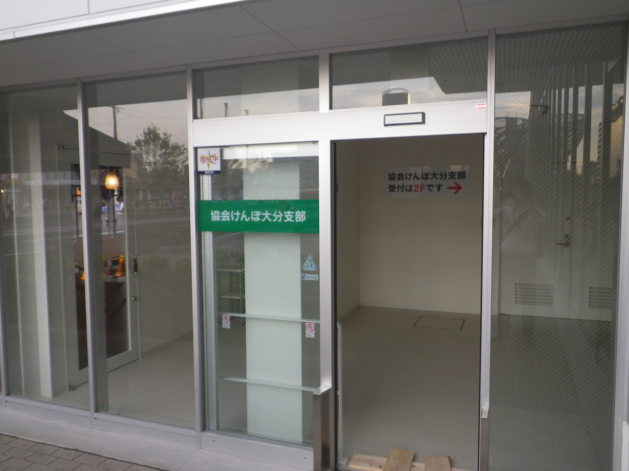 こちらが協会けんぽ大分支部の出入口を拡大したものです。自動ドアには緑地に白字で「協会けんぽ大分支部」と記載されております。