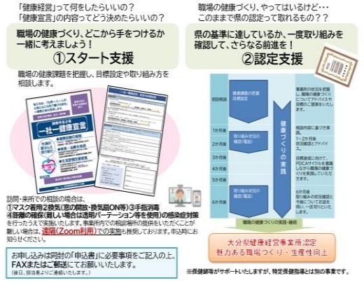 健康経営サポートでは、保健師や協会職員が職場の健康づくりに関する疑問点を解消させていただくほか、大分県の健康経営事業所認定に向けた取り組みの提案などを行います。