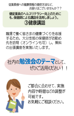 大分支部保健師が直接訪問(オンラインでも可)の上、健康講話(健診結果の見方や生活習慣改善に向けてのお話、禁煙など)を実施して職場の健康づくり推進に向けてお手伝いします。