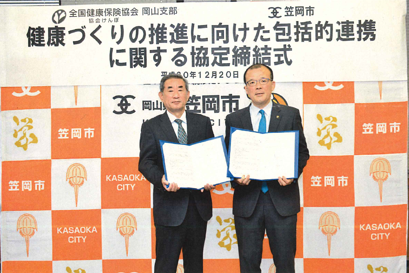 平成30年12月20日、笠岡市と全国健康保険協会岡山支部は、「健康づくりの推進に向けた包括的連携に関する協定書」を締結いたしました。