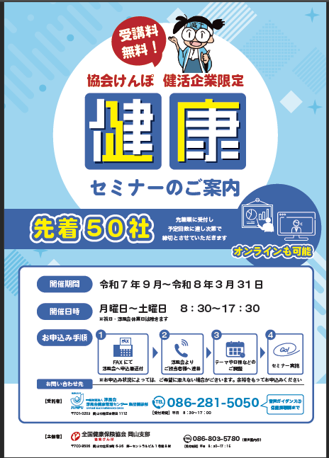 協会けんぽ岡山支部では、健活企業様(「積極的に従業員の心と体の健康づくりに取り組み、従業員の健康増進を図る企業」)を応援するため、健活企業様に向けた、専門職の講師による食事・栄養に関するセミナーを実施しております。