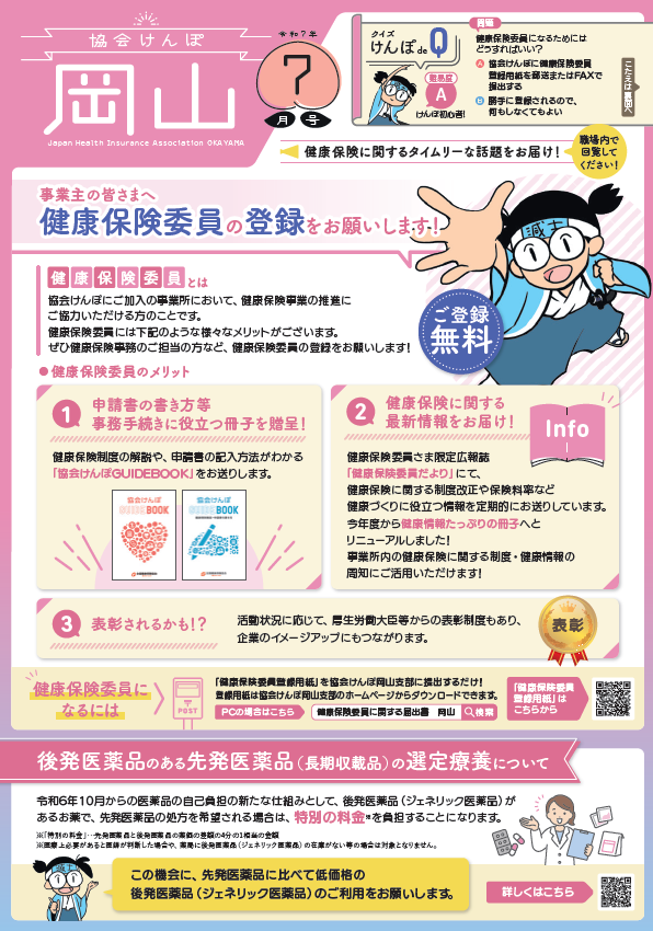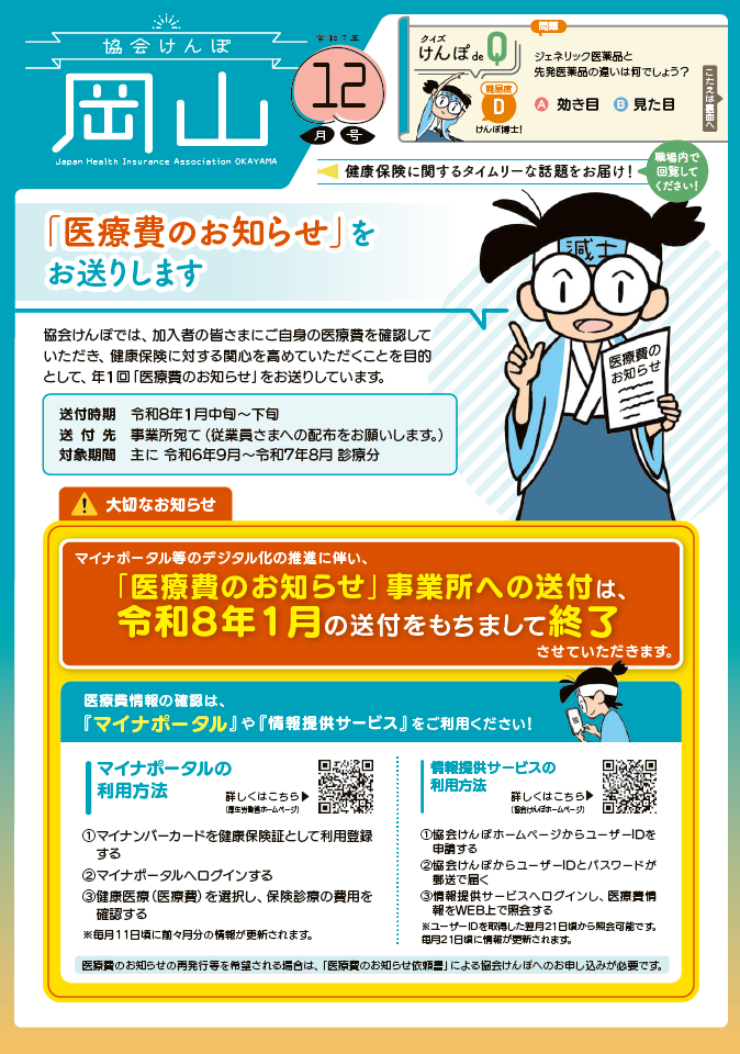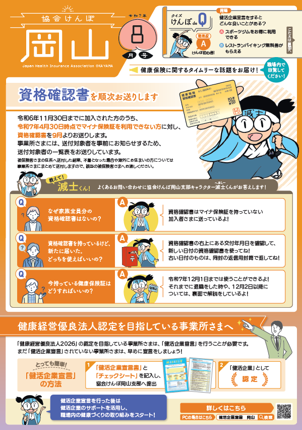 協会けんぽ岡山支部では、加入者・事業主の皆さまに健康保険の様々な制度及び健康づくりなどの大切な情報をお伝えするために、毎月広報紙を発行して、日本年金機構から事業所にお送りする納入告知書に同封しています。