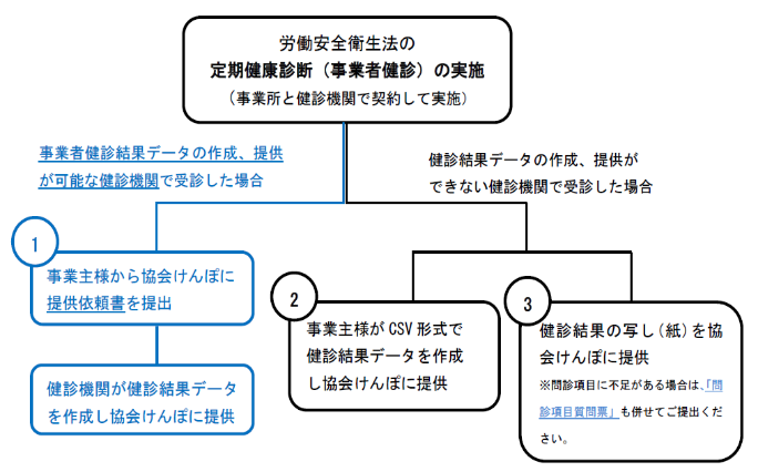 一覧に記載の健診機関で定期健康診断(事業者健診)を実施した場合は、協会けんぽに提供依頼書を提出することで、健診結果の提供が可能です。