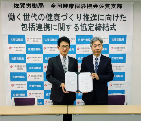 佐賀労働局と全国健康保険協会佐賀支部は、労働者である加入者及び加入事業所の健康保持増進にかかる取組を促進するにあたり、健康づくりを相互に連携、協力して推進するため、『働く世代の健康づくり推進に向けた包括連携に関する協定』を締結しました。