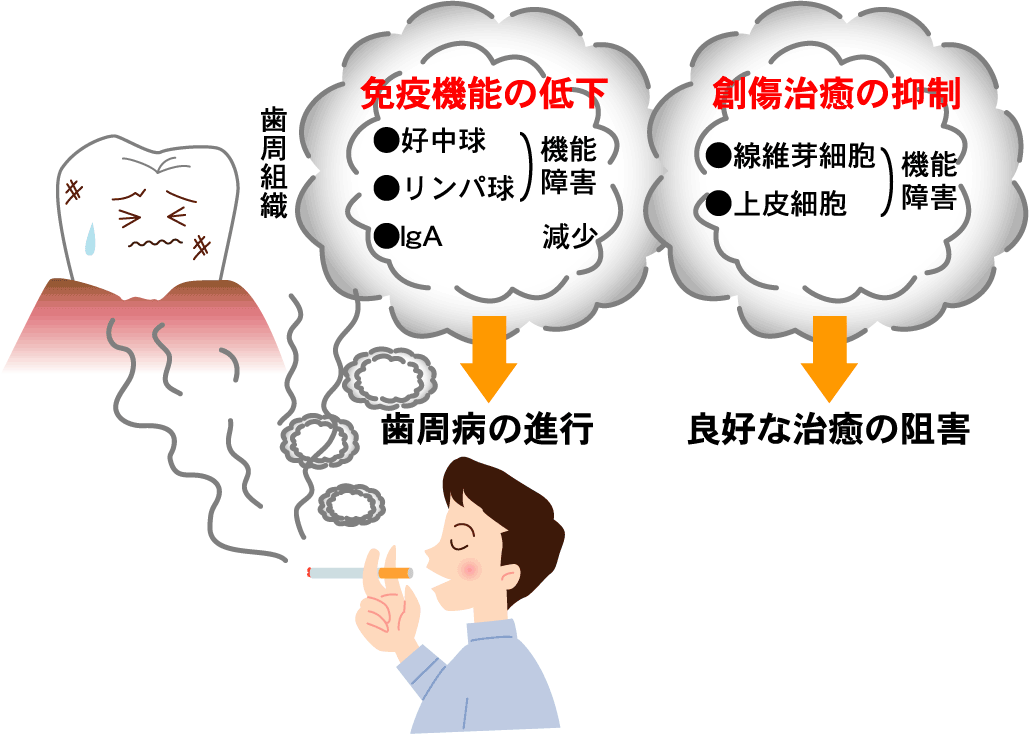 喫煙により、歯周組織の免疫機能の低下や創傷治癒遅延を引き起こし、歯周病の発症リスク、重症化リスクが高まってしまいます。