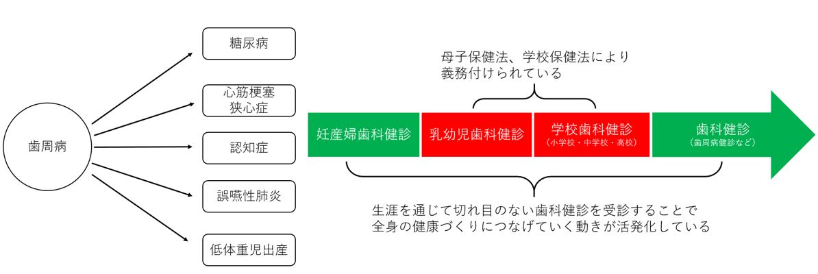 歯科の重要性に関して、2017年に国の骨太の方針に記載されはじめ、2021年には全身との関連性に係るものとして生涯を通じた切れ目のない歯科健診の重要性が記載されております。しかし、現在の主な歯科健診として妊産婦歯科健診、乳幼児歯科健診、小学校から高校までの学校歯科健診、歯周病健診などがありますが、この中で義務付けされているのは乳幼児歯科健診と学校歯科健診のみとなっております。