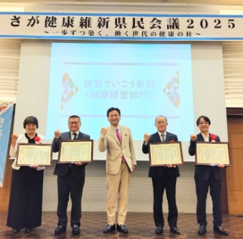 この度、健康長寿の佐賀県を目指し、様々な分野の団体、企業等が一体となって健康づくりを県民運動として取り組む、「さが健康維新県民会議2025」が令和7年9月2日(火)に開催されました。その中で健康経営に取り組み、優良企業として認定された事業所のうち、特に他の模範となる優れた事業所への表彰式「令和7年度 佐賀さいこう表彰(健康経営部門)」が行われました。4事業所が表彰され、そのうち当支部加入の事業所からは3事業所が受賞されました。