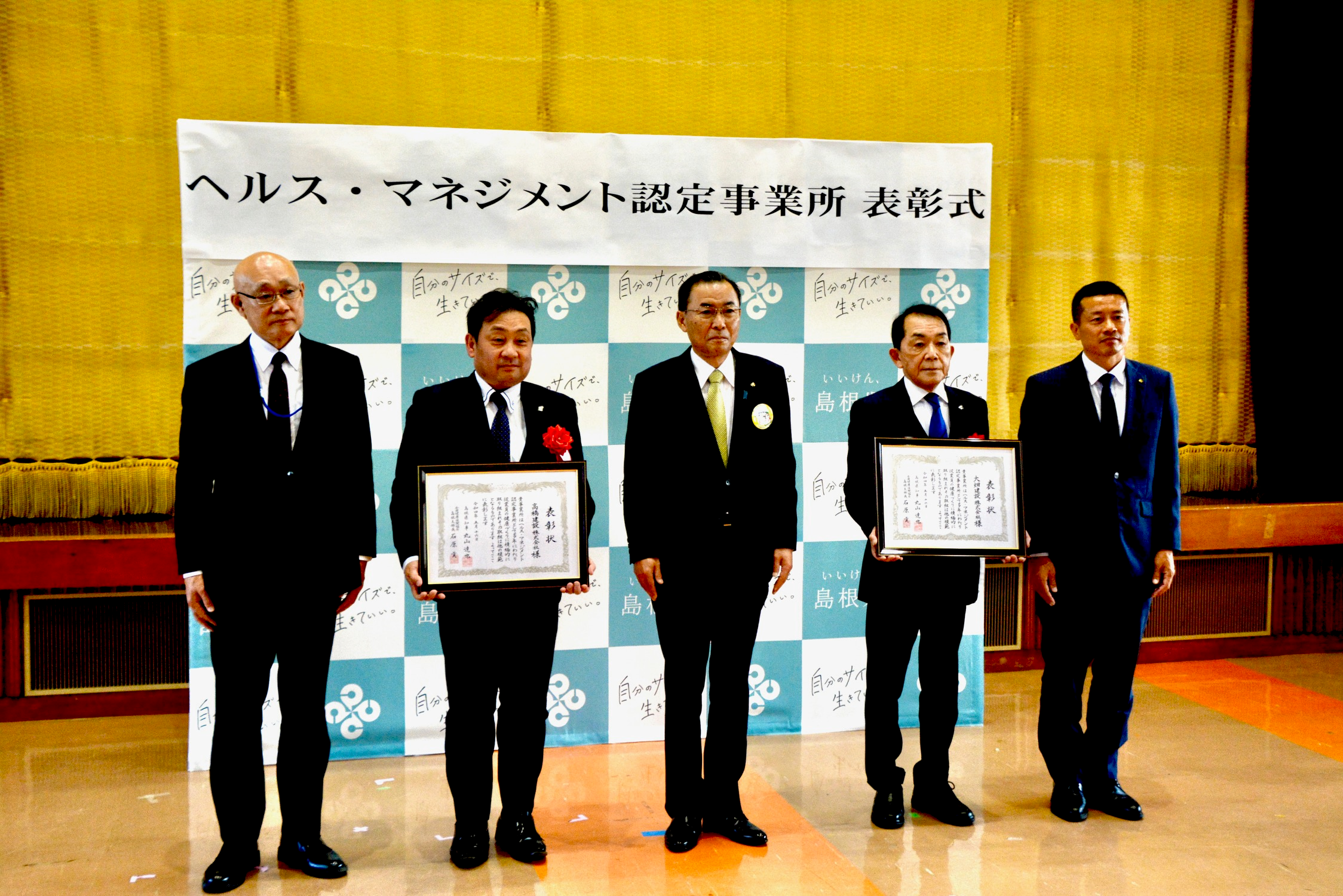 令和4年5月16日、島根県庁舎講堂にて、ヘルス・マネジメント認定制度において、健康経営に関する取り組みが顕著であると認められた、大畑建設株式会社様、高橋建設株式会社様の2社に対して、島根県丸山達也知事と協会けんぽ島根支部石原貢支部長の連名で表彰を行いました。
