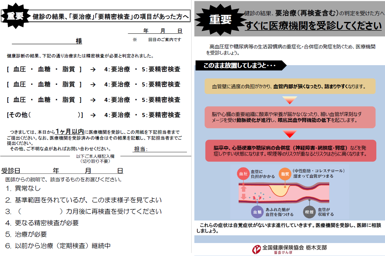 そのため、このような方の症状が重症化することを防ぐため、血圧値・血糖値が「要治療(再検査含む)」と判定された方へ、医療機関を早期に受診していただくよう文書による勧奨を行っています。