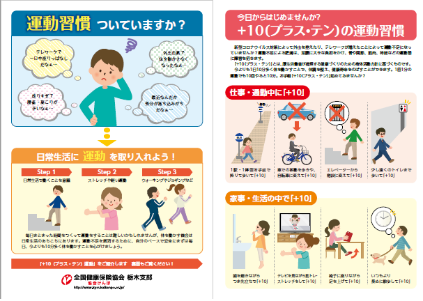 「+10(プラス・テン)」の運動習慣に関する、従業員様への情報提供に使用するためのチラシを作成しました。