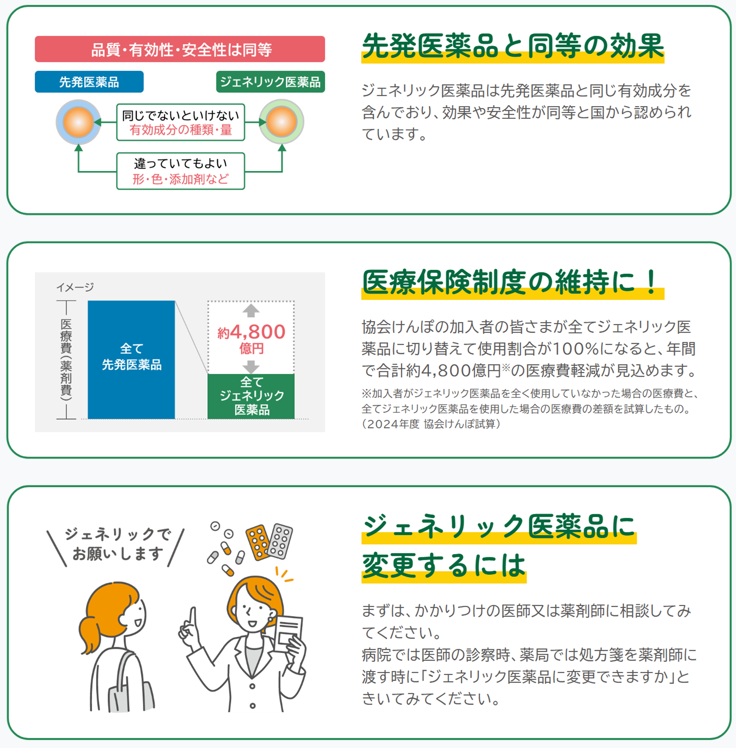 協会けんぽでは、加入者の皆さまの自己負担の軽減や 医療保険財政にも効果をもたらすことから、 ジェネリック医薬品の使用を促進しています。