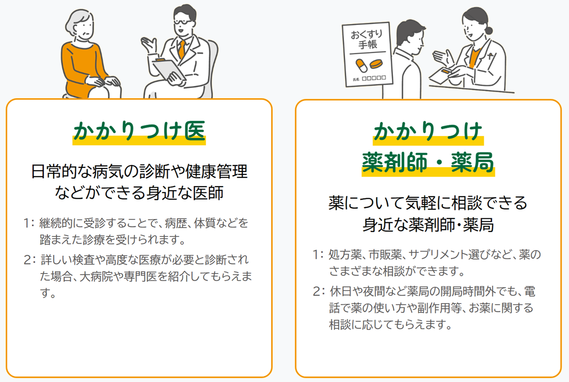 「話しやすく、相談しやすい」 「自宅や職場の近くなど、通いやすい場所にある」など、 気軽に相談できる自分に合った 「かかりつけ医・かかりつけ薬剤師・薬局」を 見つけましょう!