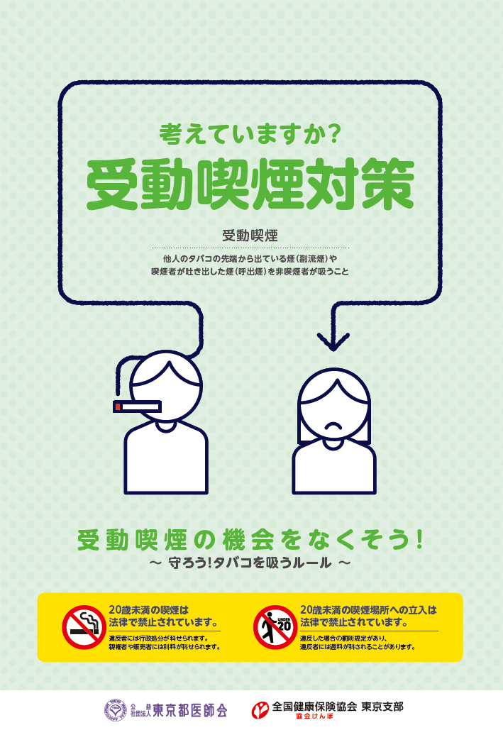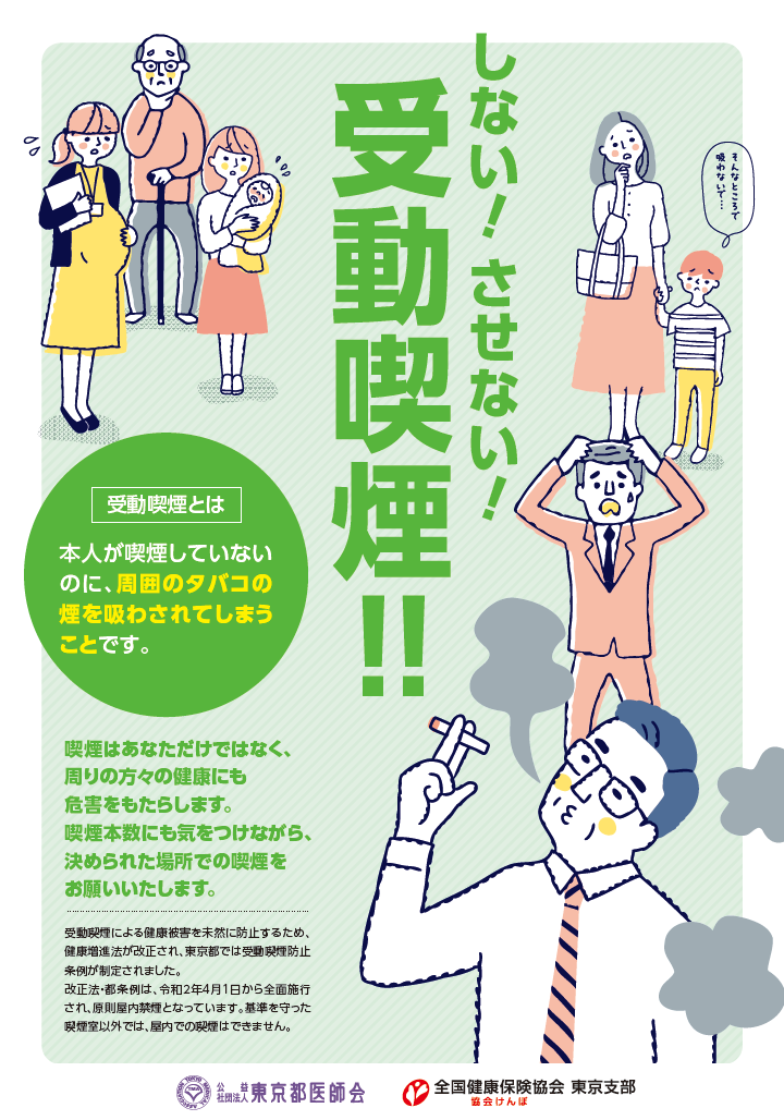 〇従業員の健康づくりのために、受動喫煙防止や禁煙への関心が高まっています。受動喫煙による健康被害を未然に防止するため、健康増進法が改正され、東京都では受動喫煙防止条例が制定されました。また近年では、企業としても適切な対応を講じることが求められています。東京支部では、事業所へのサポートの一環として東京都医師会と受動喫煙対策ポスター・リーフレットを作成いたしました。
