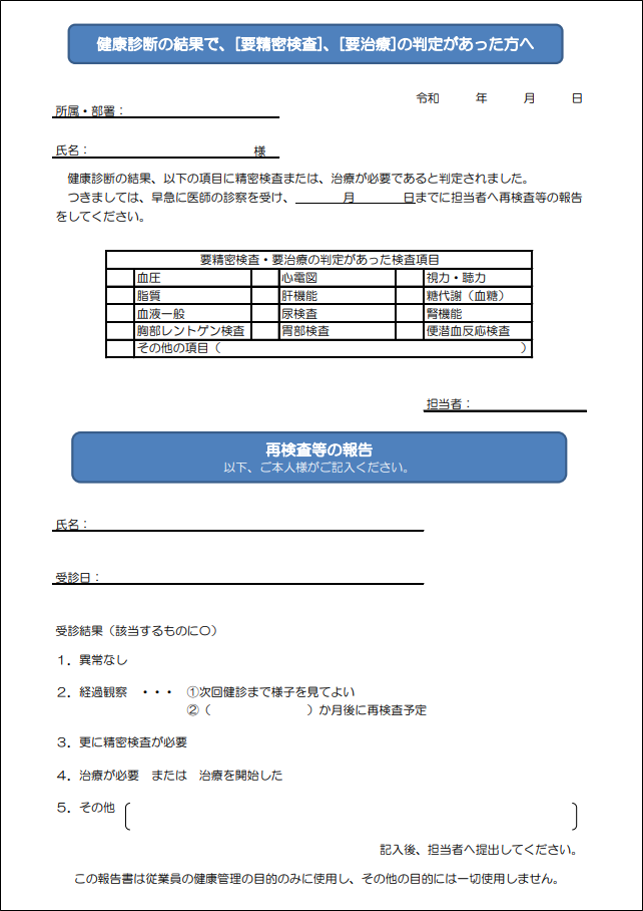 「要再検査」「要精密検査」と判定された従業員様で、医療機関を受診されていない方へは、事業所からも受診勧奨を行ってください。