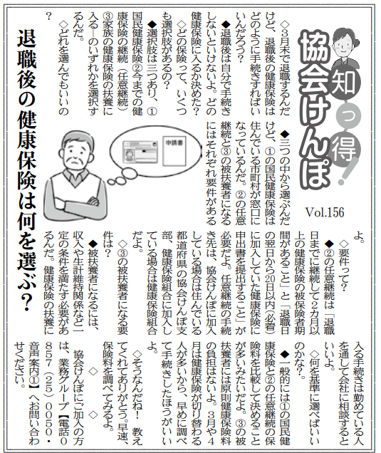知っ得!協会けんぽVol.156「退職後の健康保険は何を選ぶ?」