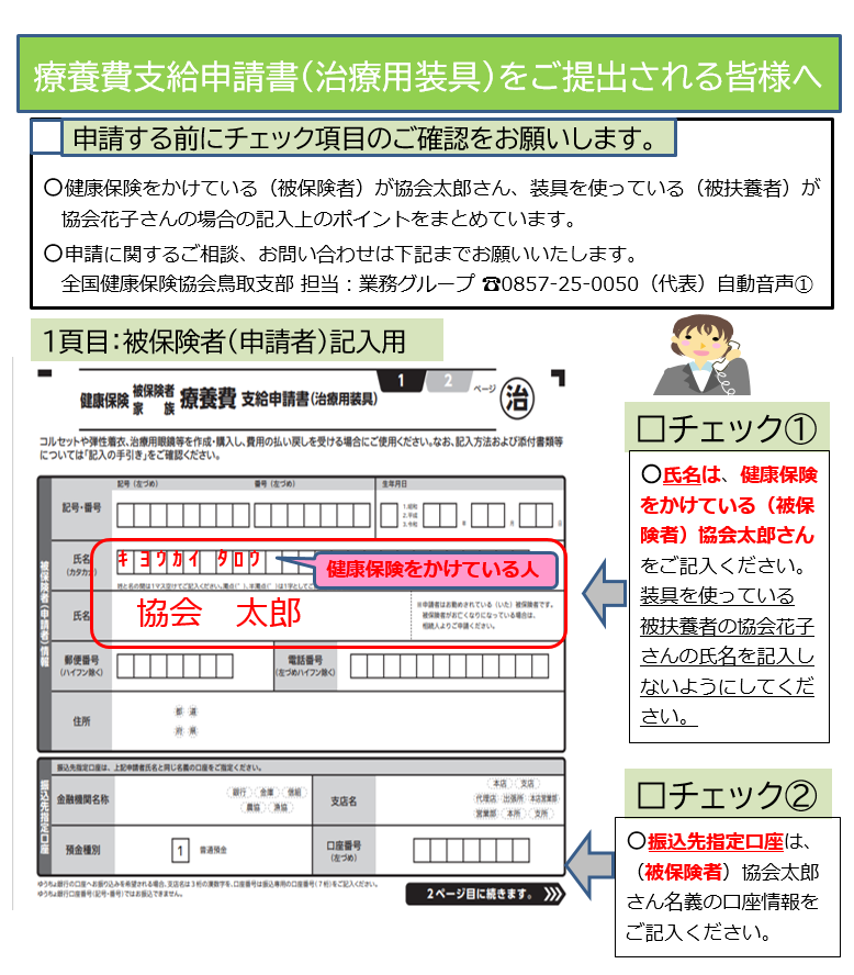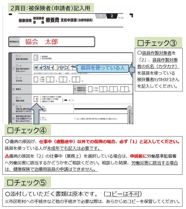 下記を参考に、被保険者氏名と装具作成対象者の氏名(カタカナ)を正しくご記入いただきますようお願いします。