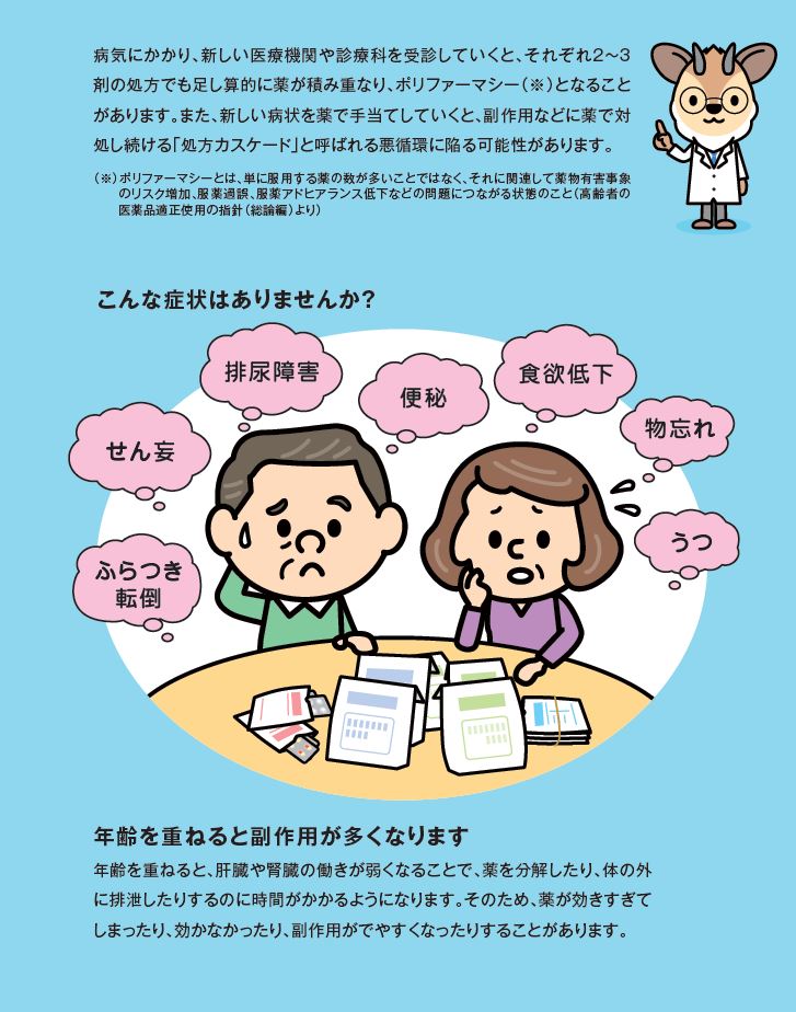 昨今、ポリファーマシーという言葉がよく聞かれるようになりました。ポリファーマシーとは、単に服用する薬剤数が多いことではなく、それに関連して薬物有害事象(副作用等の悪い影響)のリスク増加や服薬過誤等の問題につながる状態のことをいいます。
