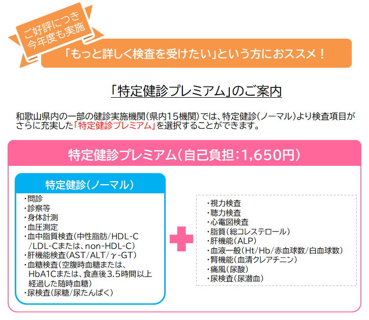 和歌山県内の一部の健診機関(県内15機関)では、特定健診(ノーマル)より検査項目がさらに充実した「特定健診プレミアム」を選択することができます。