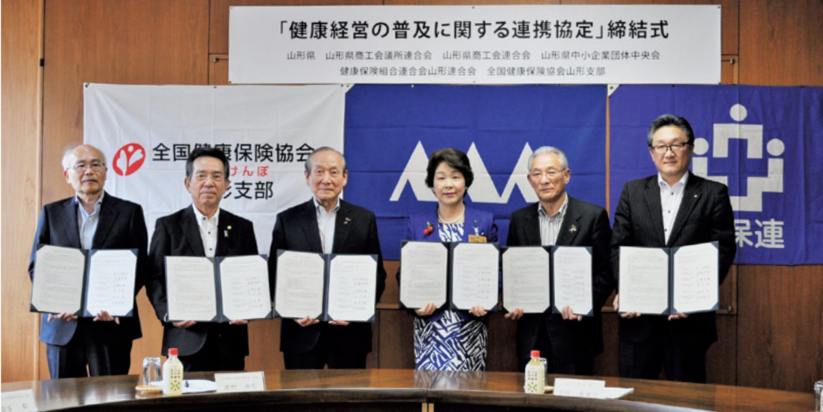 山形県、県内経済3団体、健康保険組合連合会山形連合会と健康経営の普及に関する連携協定を締結しました(令和元年5月24日)